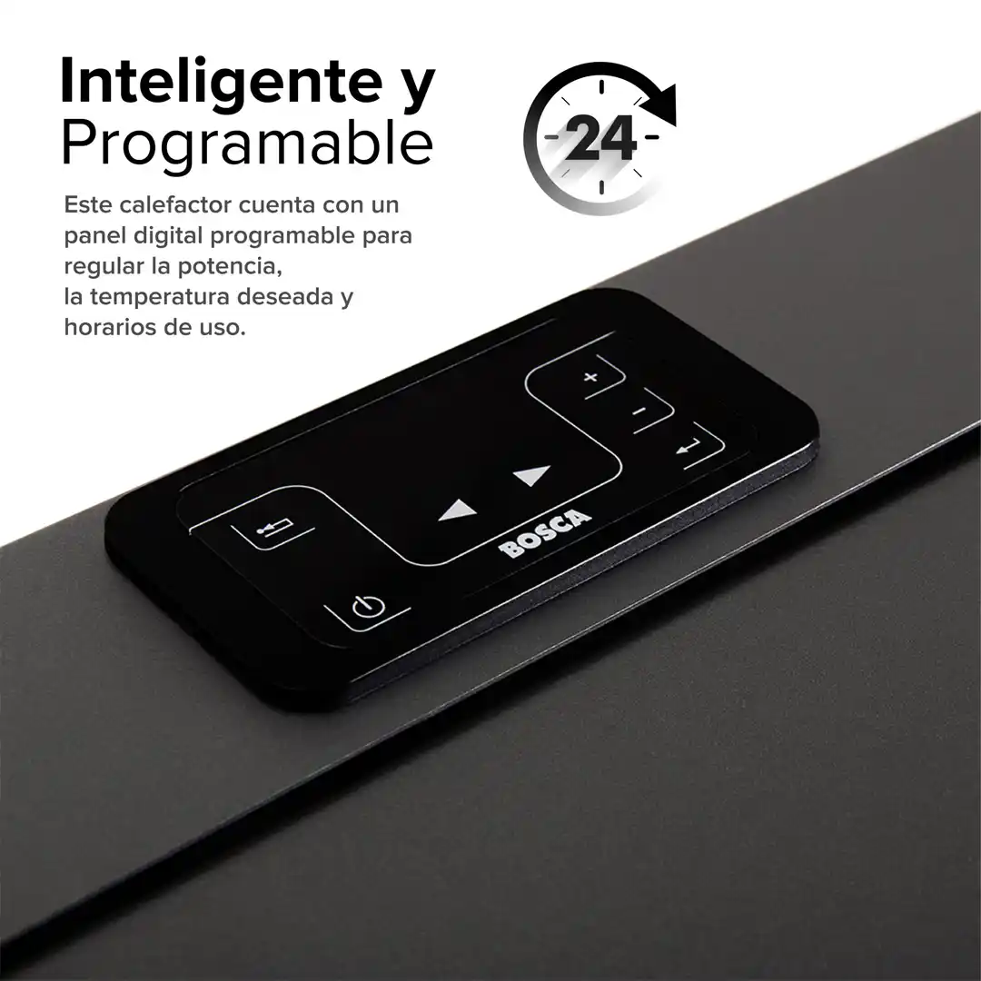 - Inteligente y programable: Esta estufa cuenta con un panel digital programable para regular la potencia, la temperatura deseada y horarios de uso