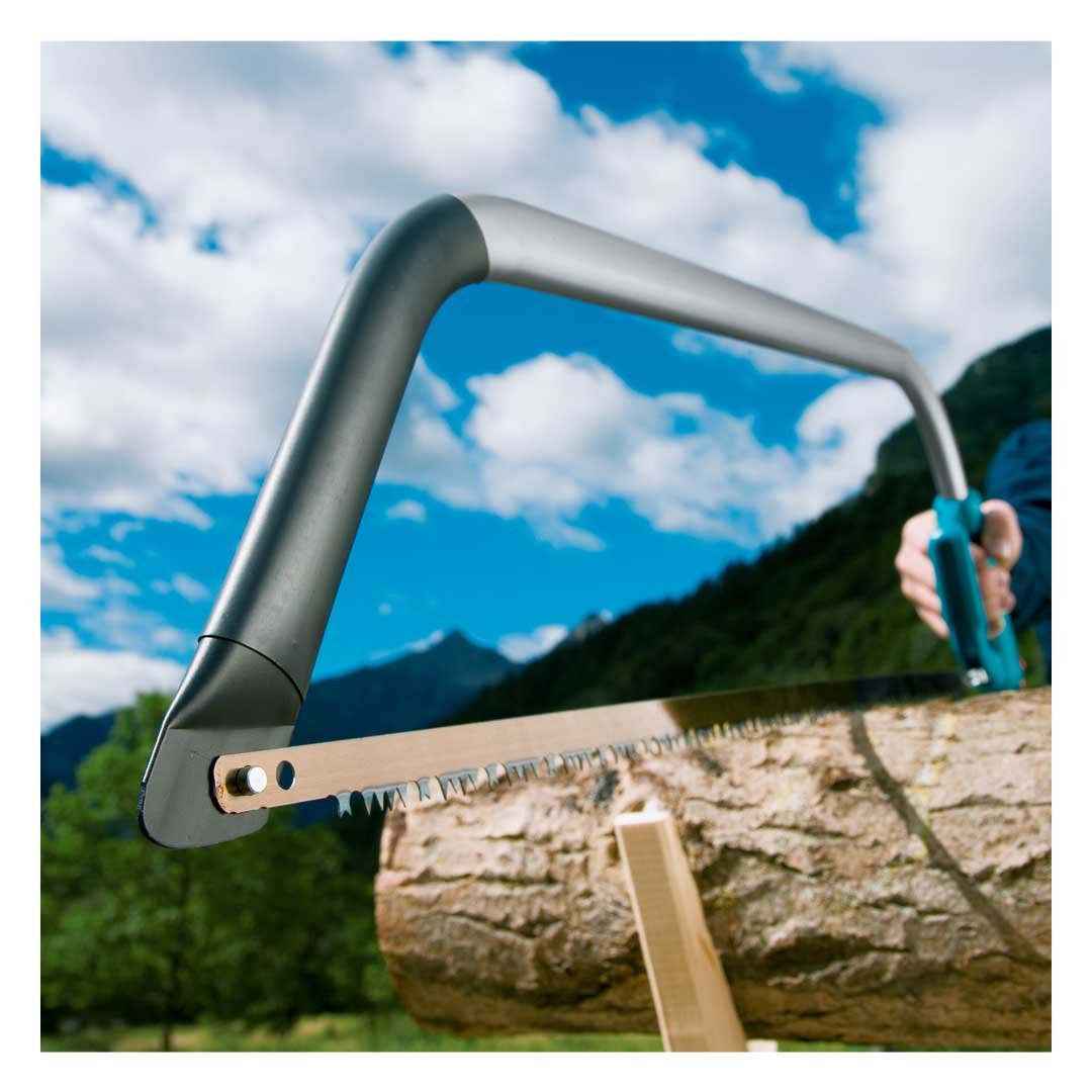 - Para conseguir un trabajo eficaz, la tensión de la hoja se puede ajustar fácilmente mediante un mecanismo de tornillos. La hoja se puede reemplazar fácil y rápidamente sin herramientas. La protección de toda la hoja permite un transporte seguro y el almacenamiento de la sierra de arco.